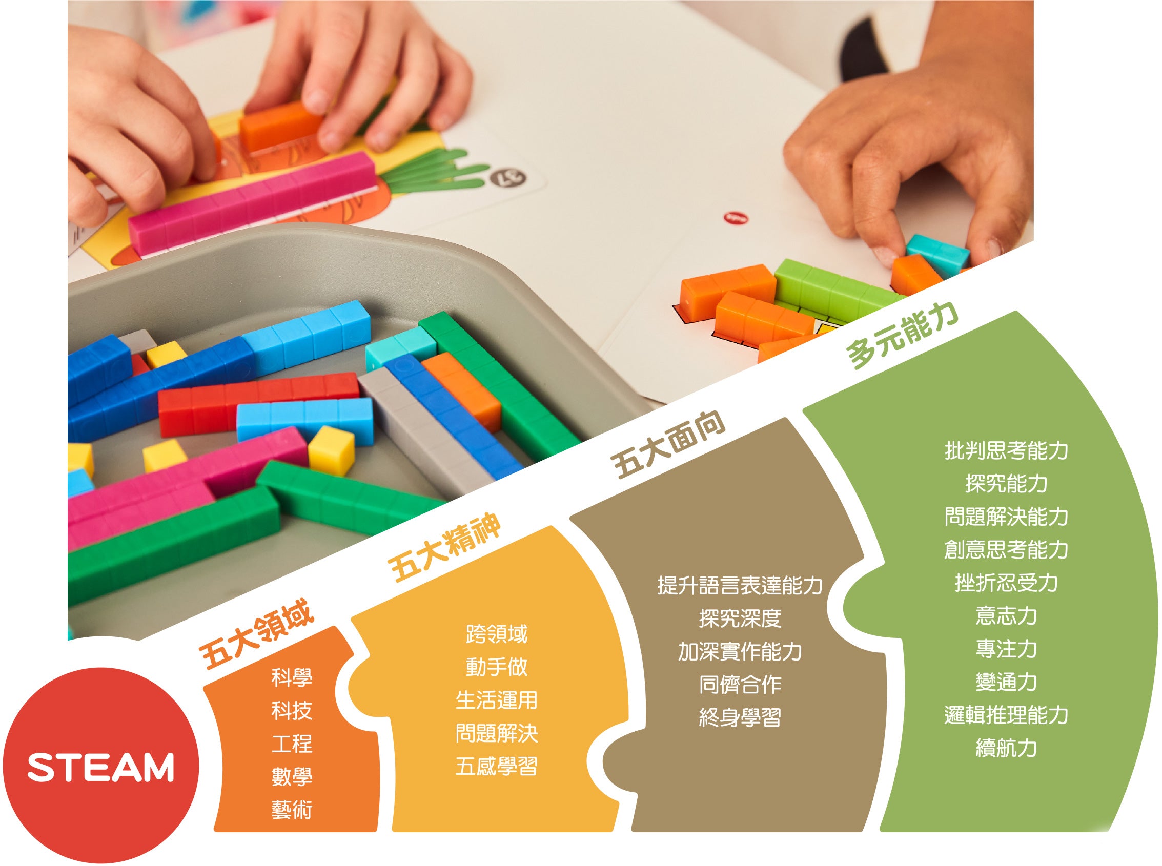透過教具操作(Hands-on),引起學習動機,將抽象的理論具體呈現,陪孩子一起越玩越聰明。