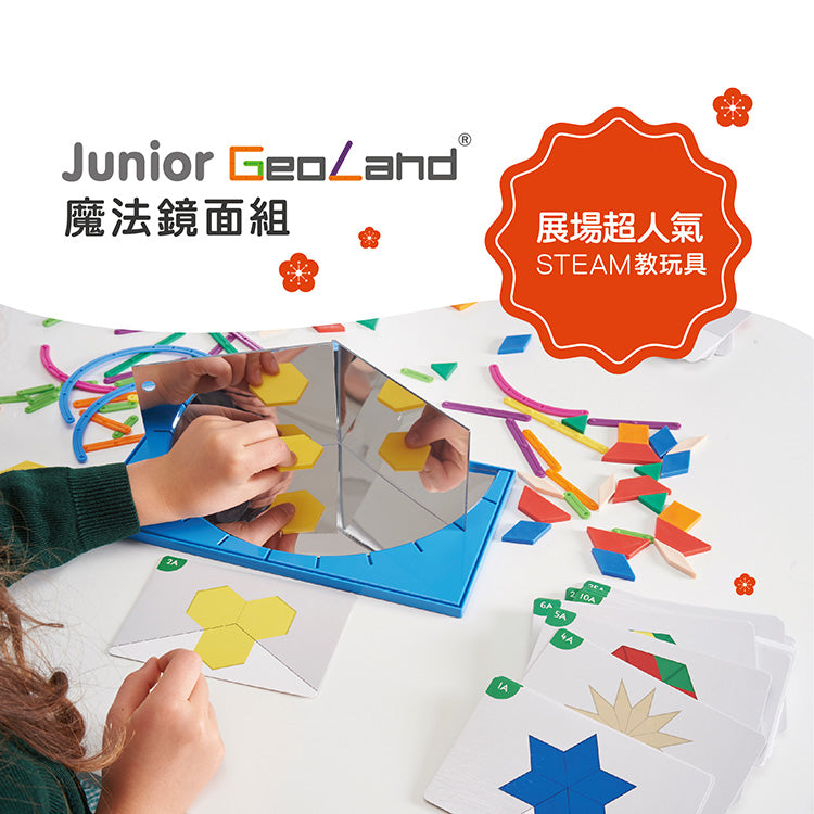 Edx 獨家設計的魔法鏡面系列產品,利用長形平面鏡或兩個長方形鏡,再搭配底部的半圓鏡,來變化出不同角度的鏡像,刺激孩子的想像,並引起好奇心,慢慢的從中感受反射與對稱的概念,搭配六形六色板和七彩魔法條,可以讓孩子在操作中漸漸認識幾何圖形,並發揮創意,陪孩子一起做出獨一無二的萬花筒吧!