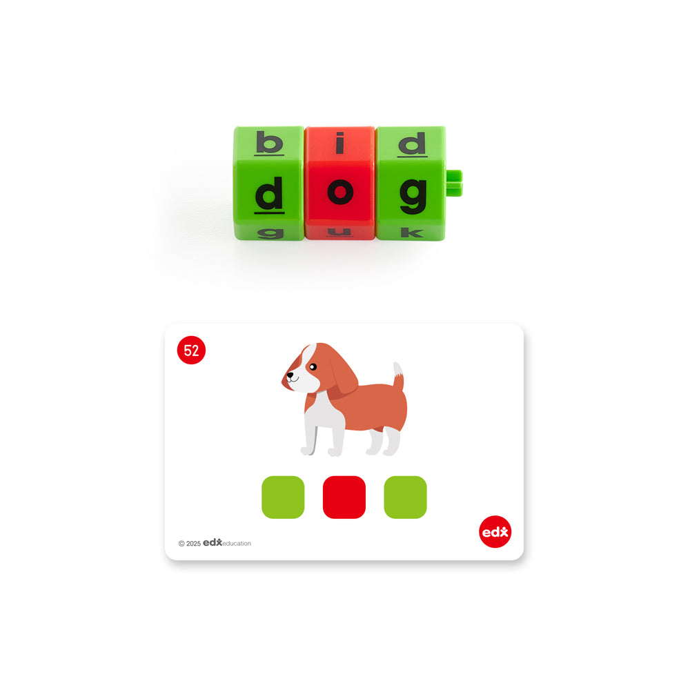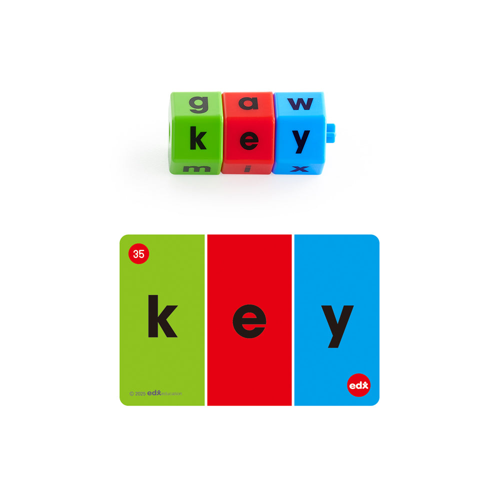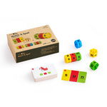 1.六角積木每面印有字母,可從配對顏色開始再轉動積木,結合 CVC 字母邏輯,練習子音與母音的拼讀基礎。